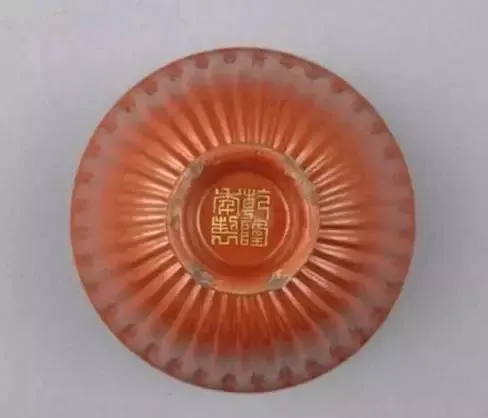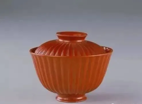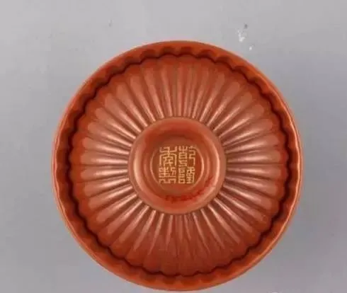 这是一件仿照漆器釉色的盖碗。碗呈菊瓣式,圆口,深弧腹,圈足外撇。盖为覆碗式,菊瓣形口,盖面隆起,上置圈形抓纽。盖内金彩书乾隆御题诗一首:“制是菊花式,把比菊花轻。啜茗合陶句, 浥露掇其英。”碗内外通施仿朱漆釉,色质逼真。外底署金彩篆书“乾隆年制”双行四字款。