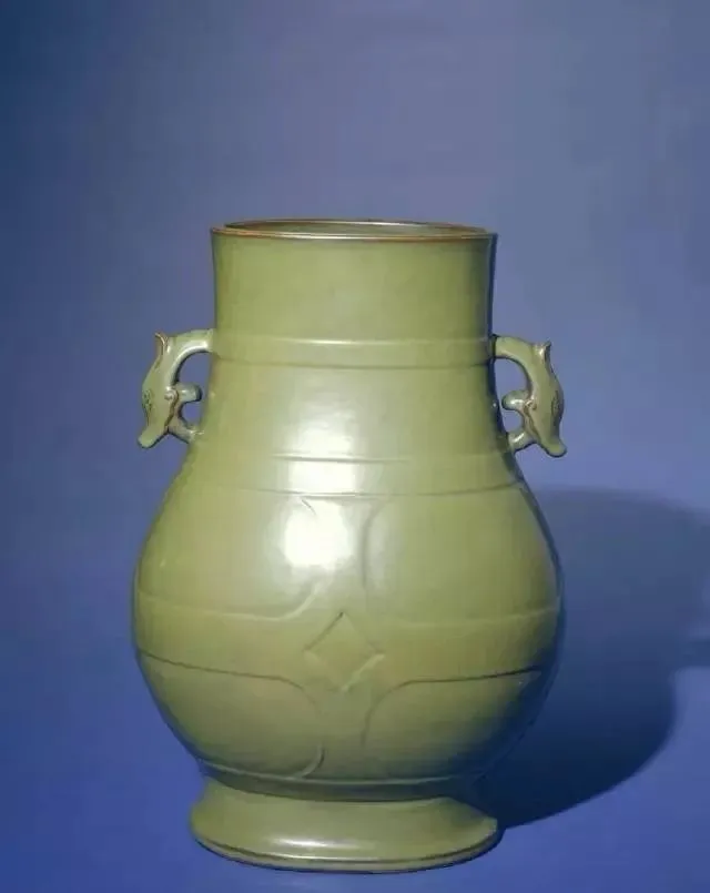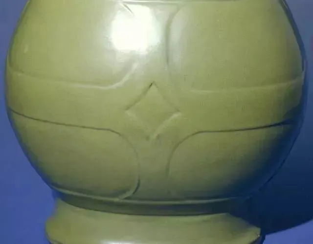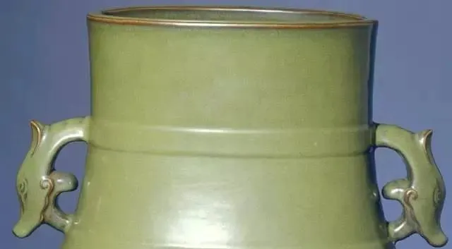 “牺”指的是古代供宗庙祭祀用的毛色纯一的牲畜,这个尊的双耳就是仿造的“牺”的形状。茶叶末釉是厂官釉中的一种。厂官釉属于铁、镁结晶釉,由于烧成工艺的某些差异,其色调有多种变化,有的似鳝鱼腹际色,俗称“鳝鱼黄”,有的像茶叶研成的细末之色,俗称“茶叶末”。此尊上的釉即可称作茶叶末釉。