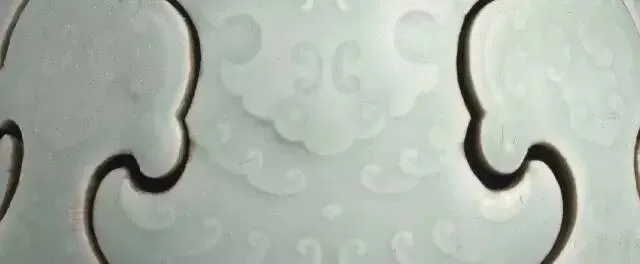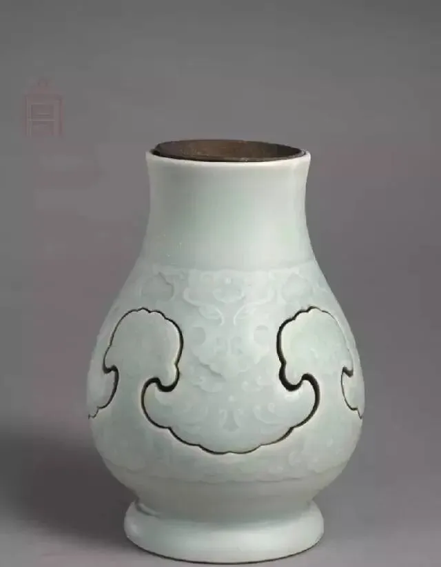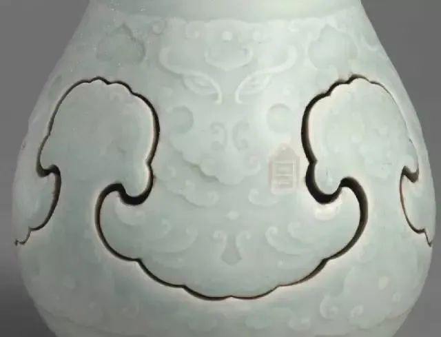 尊口外撇,短颈,溜肩,弧鼓腹,圈足跟外撇。通体施粉青釉,腹部模印兽面纹、云纹。在器腹中部采用镂雕的手法把器腹分为上下两部分,并以正、覆如意头的造型相扣,内置铜胆供插花用。外底以青花书“大清乾隆年制”三行六字篆书款。