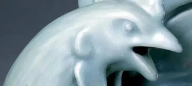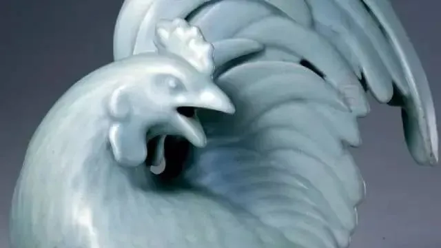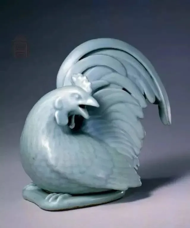 清代乾隆时期,为了体现高超的制瓷水平,御窑厂经常烧造一些具有实用功能的陶瓷雕塑器,这件粉青釉鸡形熏就是其中之一。雄鸡尾羽舒展,神态逼真,采用了镂空剔雕的工艺技法。熏香时,可把香料放在底座中,燃出的烟雾从雄鸡的口和翅间袅袅飘出,可谓用心巧妙。鸡与“吉”谐音,寓意吉祥,同时也有暗示皇帝要“闻鸡起舞”而勤政之意。
