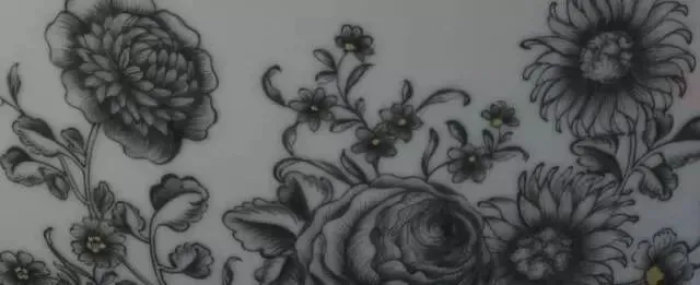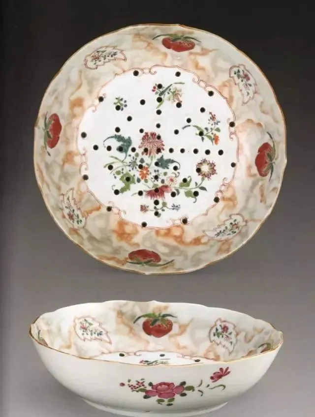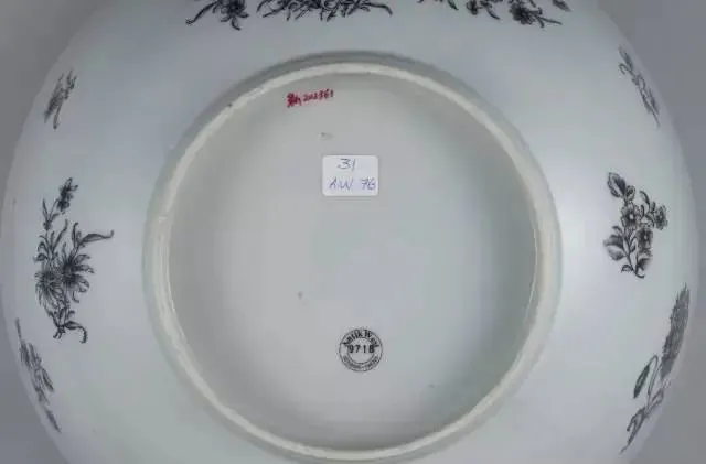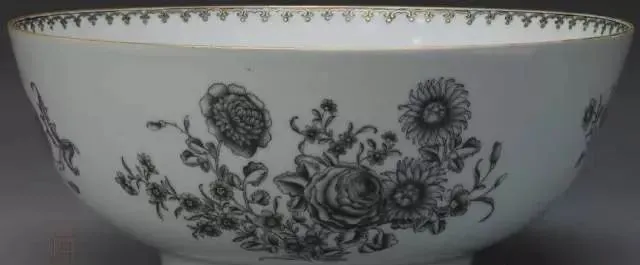 碗敞口,圈足。外壁用黑彩描绘簇拥的各种花卉纹,花蕊上用金彩点缀。口沿饰以金彩。碗内心描金画瑞典支票图案,支票上日期注明是1762年8月11日,可以知道这只碗烧制的大致时间。