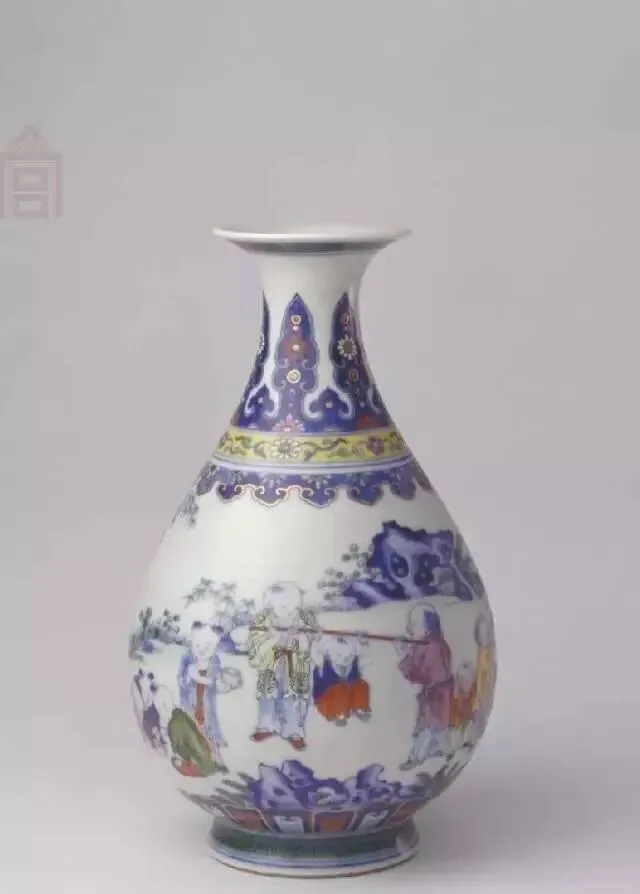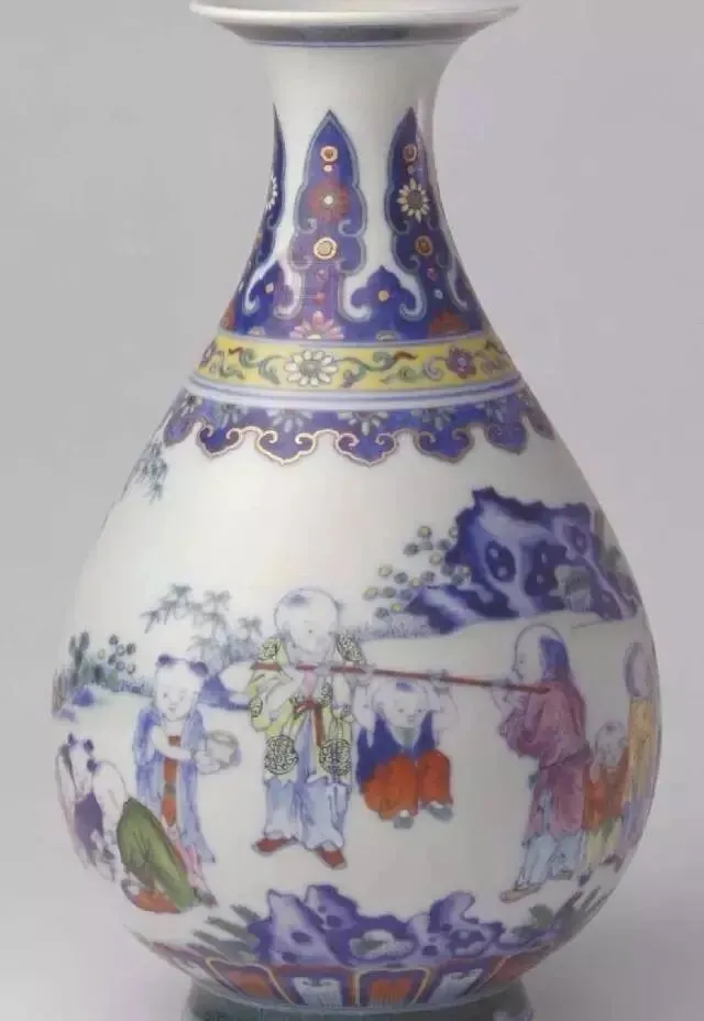 瓶圆唇,撇口,细颈,溜肩,垂腹饱满,圈足,足跟外撇。通身以斗彩装饰。腹部绘通景庭院婴戏图为主题图案。以竹石、芭蕉、栏杆、野花作衬景,16童子或捉迷藏,或斗蟋蟀,或抬杠等,衣服色彩各异,并加以描金。瓶颈部饰变形蕉叶纹、黄地折枝花纹和垂如意头纹。近足处绘变形莲瓣纹,足部饰回纹一周。瓶底书青花“大清乾隆年制”三行六字篆书款。