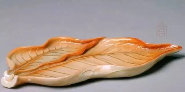 笔掭叶形,通体施黄釉,釉面莹亮,釉色黄中泛红,叶缘红色愈深。器面的叶脉描画清晰并以描金装饰,器底亦雕出叶背脉络,全器宛如叠置的大小两片秋风中飘落的红叶。