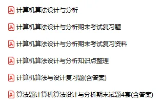 今天分享的资料是「计算机算法设计与分析」电子版+学习笔记+知识点总结+期末考试重点+复习资料+习题集及答案+名词解释+历年真题试卷及答案+题库及答案+复习重点+思考题及参考答案+公式总结+考试重点基础题+知识总结+高清PDF可打印+免费分享!