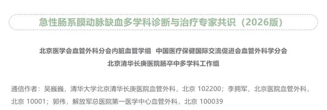 本共识由北京医学会血管外科分会内脏血管学组、中国医疗保健国际交流促进会血管外科学分会及北京清华长庚医院肠卒中多学科工作组联合制定,聚焦于急性肠系膜动脉缺血(AMI)这一危重急腹症(除外肠系膜上动脉夹层及主动脉夹层所致者)。
