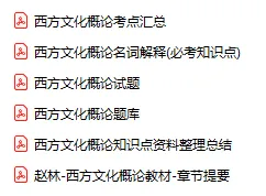 今天分享的资料是「西方文化概论」电子版+学习笔记+知识点总结+期末考试重点+复习资料+习题集及答案+名词解释+历年真题试卷及答案+题库及答案+复习重点+思考题及参考答案+公式总结+考试重点基础题+知识总结+高清PDF可打印+免费分享!