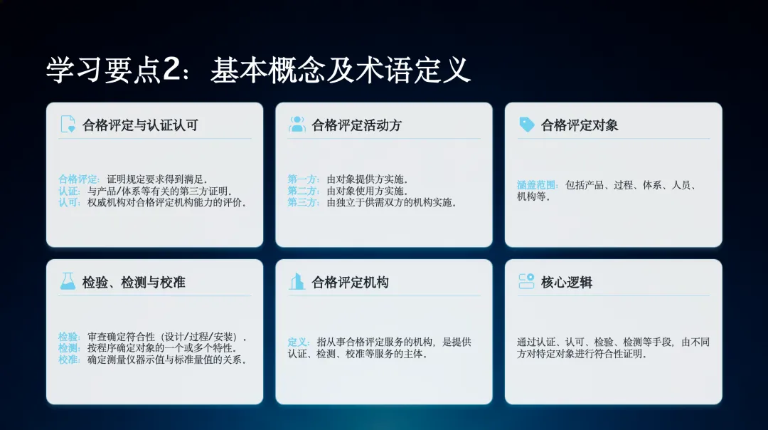 下来,我们了解一些与合格评定相关的基本概念和术语,包括认证、认可、检验、检测、校准等,以及不同方实施的合格评定活动。
