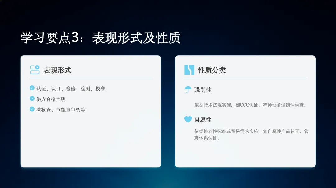 合格评定的表现形式多种多样,包括认证、认可、检验等。根据其性质,又可以分为强制性和自愿性两类。