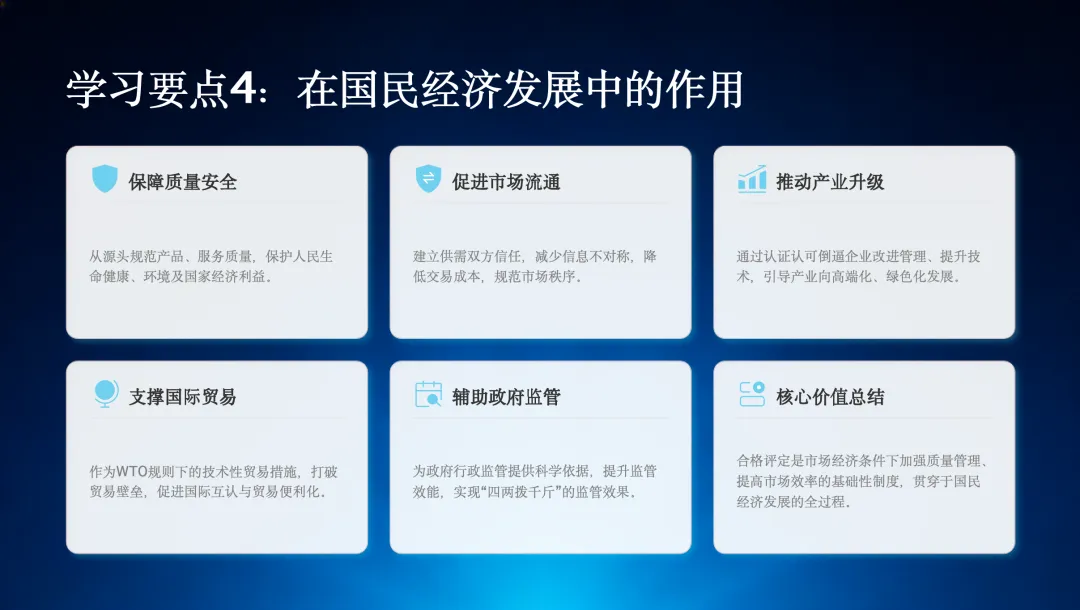 合格评定在国民经济发展中扮演着重要角色,它不仅能保障质量安全、促进市场流通,还能推动产业升级、支撑国际贸易,并辅助政府进行更有效的监管。