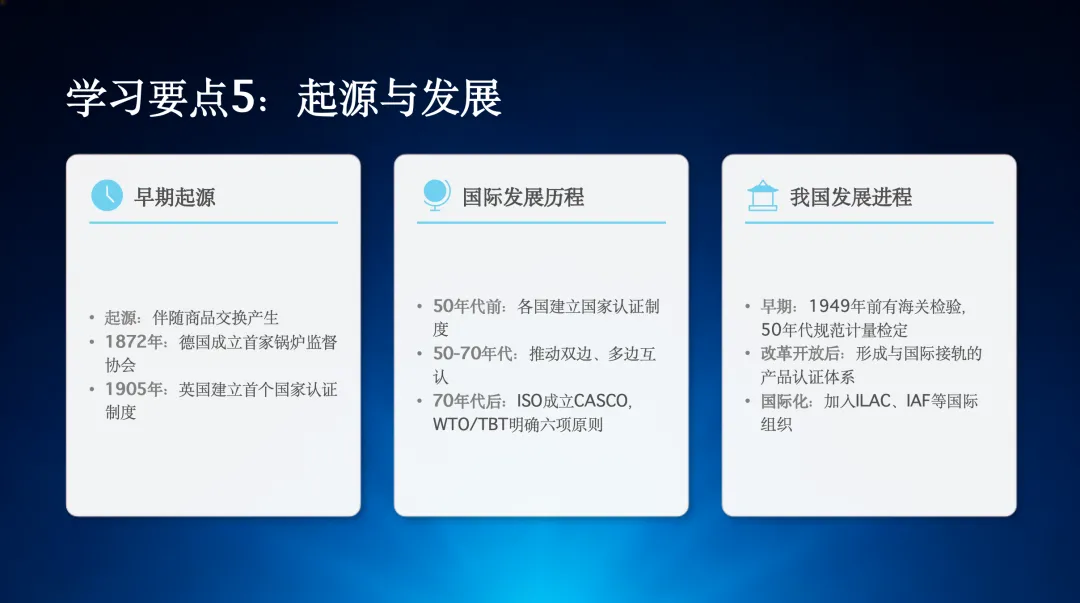 合格评定的起源可以追溯到商品交换时期。在国际上,它经历了从国家认证制度到国际互认的发展过程。在我国,合格评定体系也从早期的海关检验逐步发展到今天与国际接轨的完整体系。