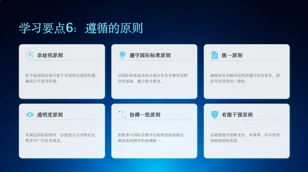 WTO/TBT协议为合格评定规定了六项核心原则,包括非歧视、遵守国际标准、统一、透明度、协调一致和有限干预原则,这些是各国开展合格评定的基本遵循。