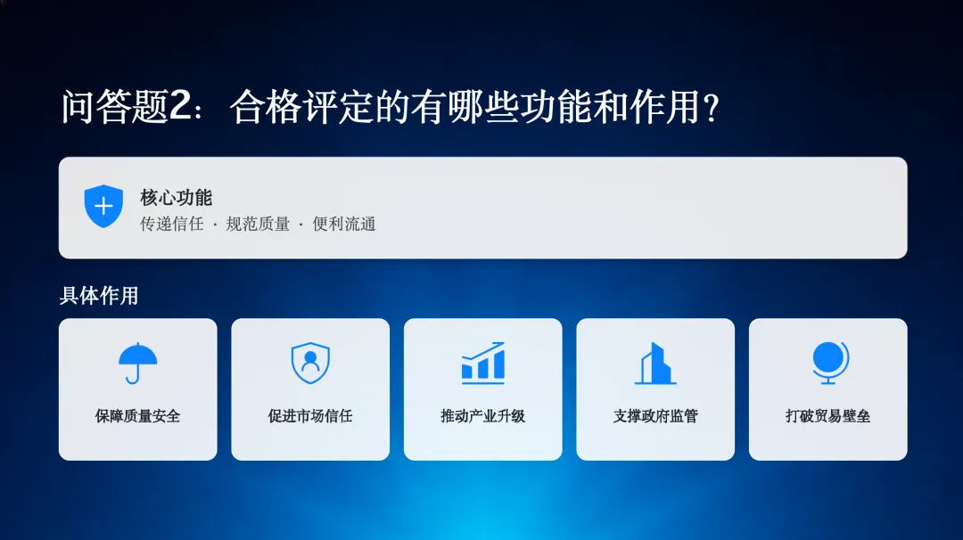 第二个问题,合格评定的功能和作用是什么?其核心功能是传递信任、规范质量、便利流通,具体作用包括保障质量安全、促进市场信任、推动产业升级、支撑政府监管和打破贸易壁垒。