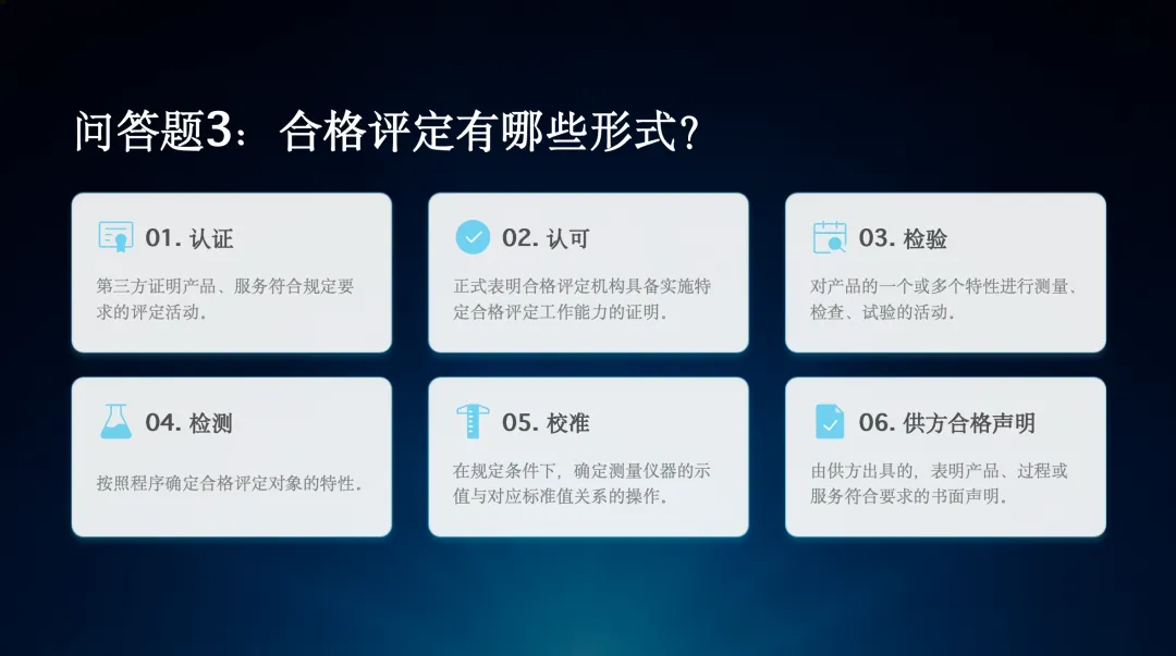 第三个问题,合格评定有哪些形式?主要包括认证、认可、检验、检测、校准、供方合格声明以及其他如碳核查等形式。