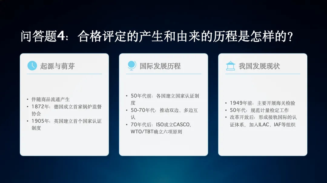 第四个问题,合格评定的产生和由来的历程是怎样的?它起源于商品流通时期,在国际上经历了从国家认证到国际互认的发展,在我国也从早期的检验活动逐步发展为完善的体系。