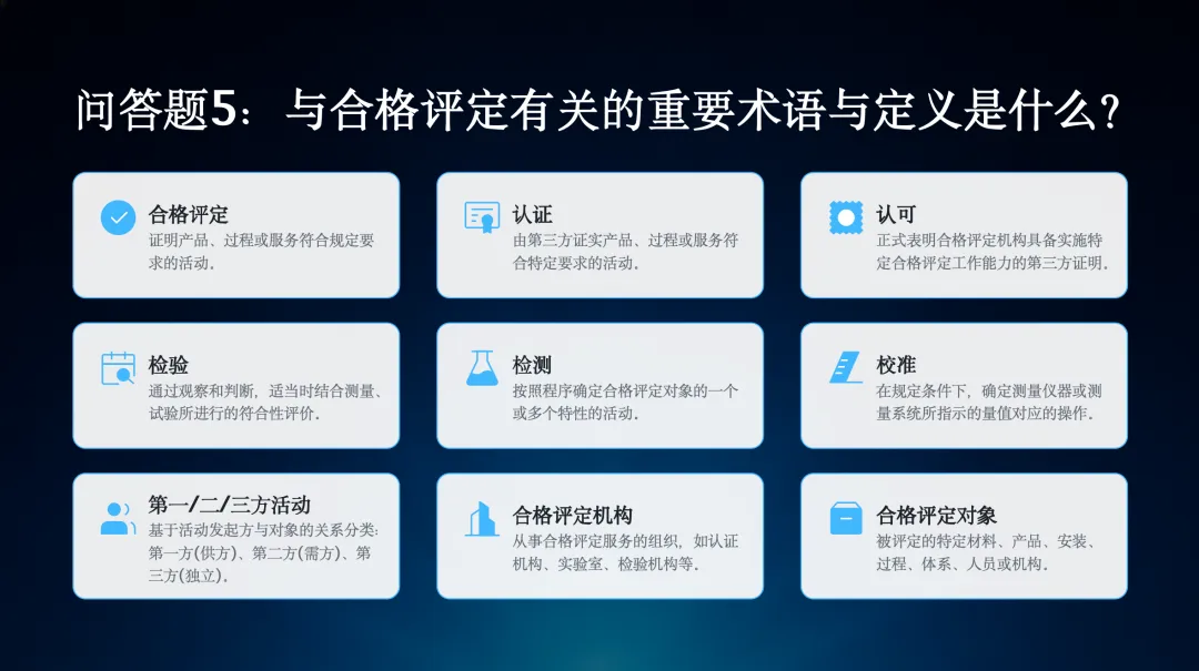 第五个问题,与合格评定有关的重要术语与定义是什么?这里我们再次回顾一下合格评定、认证、认可、检验、检测、校准等关键术语的定义。