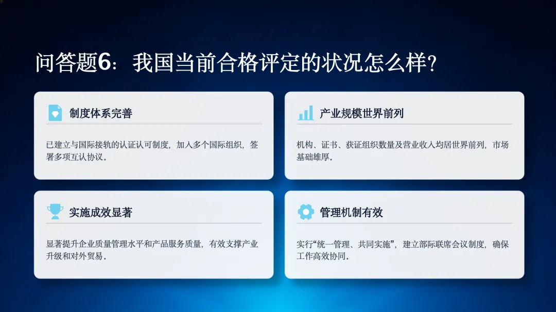 第六个问题,我国当前合格评定的状况怎么样?我国已经建立了完善的制度体系,产业规模庞大,实施成效显著,并拥有有效的管理机制。