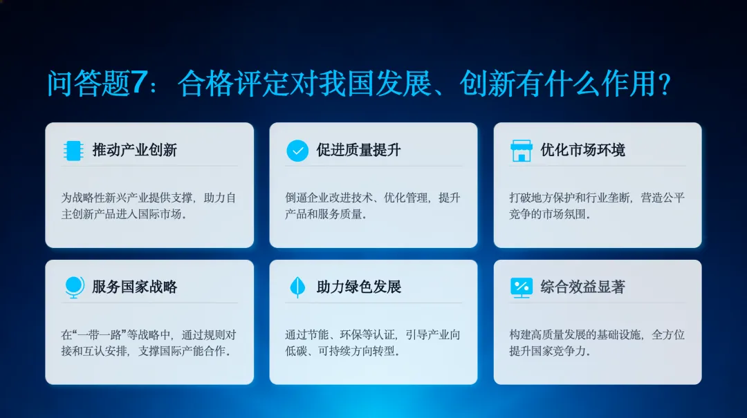 第七个问题,合格评定对我国发展、创新有什么作用?它在推动产业创新、促进质量提升、优化市场环境、服务国家战略和助力绿色发展等方面都发挥着重要作用。