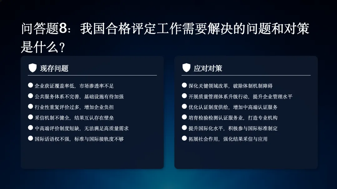 第八个问题,我国合格评定工作需要解决的问题和对策是什么?当前存在企业覆盖率低、服务体系不完善等问题,需要通过深化改革、优化制度供给、提升国际化水平等对策来解决。
