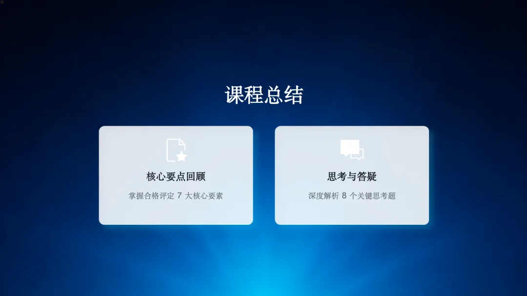 我们来简单总结一下今天的内容。我们学习了合格评定的7个核心要点,并解答了8个思考题,希望通过这次学习,大家能对合格评定有一个更全面的认识。