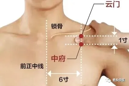 ①中府穴:位于云门穴下一寸半至一寸六处,大致隔一个肋骨,靠近肺部。
