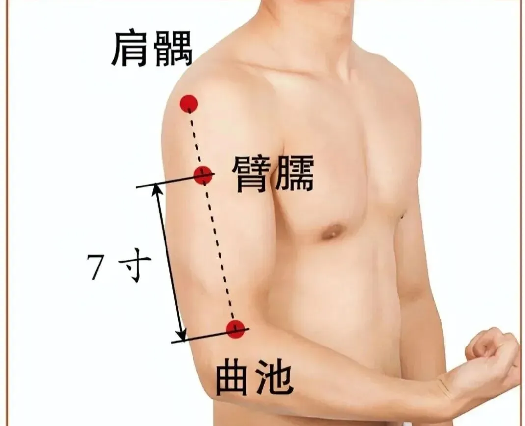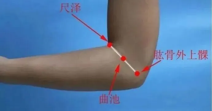 ①曲池穴:手臂弯曲90度,手掌朝向胸部,尺泽与肱骨外上髁连线中点处,此处为曲池穴。