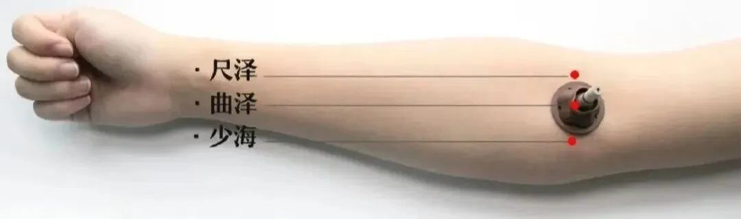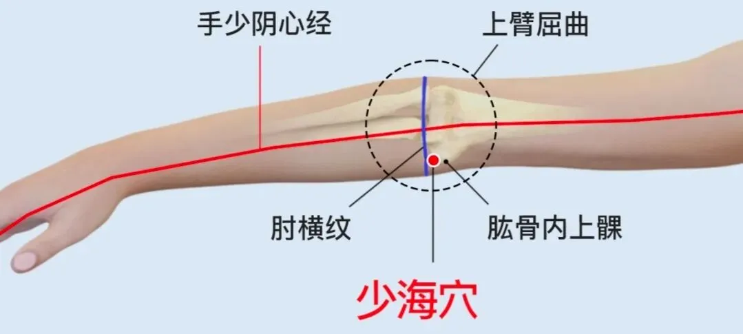 ②少海穴:位于肘横纹内侧端,与肱骨内上髁连线之中点,曲池穴下方约15度偏移处。