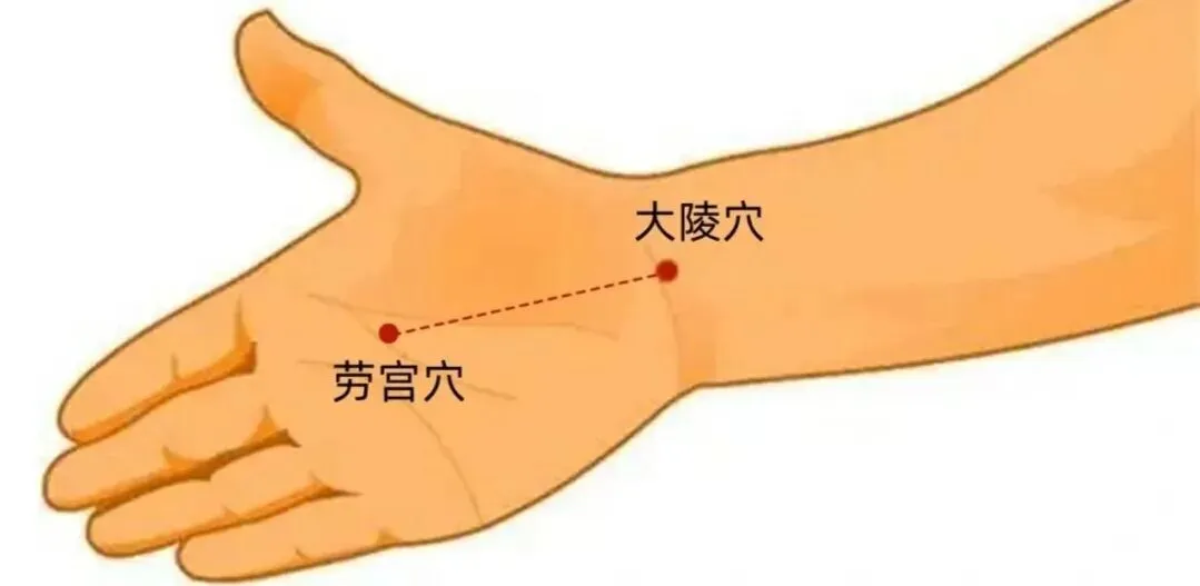 ②劳宫穴:在手掌心,第2、3掌骨之间,握拳时中指尖处。