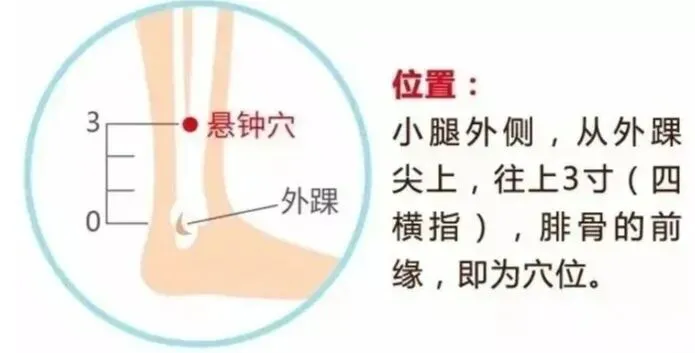 ①悬钟穴:位于小腿外侧,外踝尖上3寸,腓骨前缘。