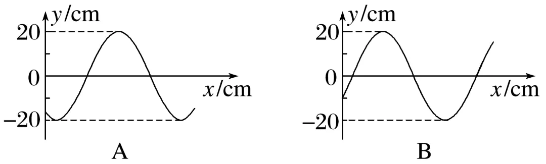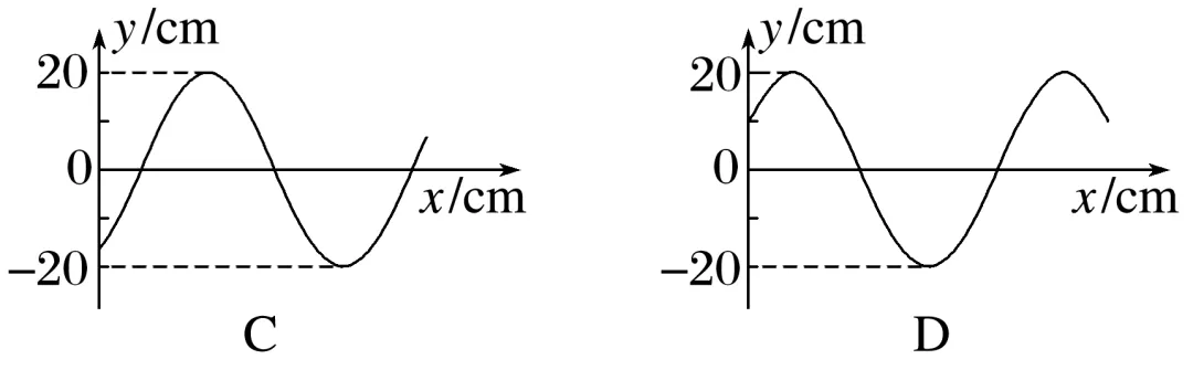 解析 由O点的振动图像可知,周期为T=12 s,振幅A=20 cm。设原点处的质点的振动方程为y=Asin (2πTt+φ),将(0,10 cm)代入,解得φ=π6,在t=7 s时刻,y7=20sin (2π12×7+π6) cm=-103 cm≈-17.3 cm,因7 s=12T+112T,由题可知在t=7 s时刻质点在y轴负半轴向下振动,根据“同侧法”可判断若波向右传播,则波形如C所示;若波向左传播,则波形如A所示,故选A、C。