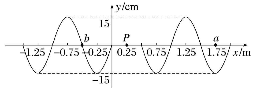 (多选)(2022·浙江6月选考)位于x=0.25 m的波源P从t=0时刻开始振动,形成的简谐横波沿x轴正负方向传播,在t=2.0 s时波源停止振动,t=2.1 s时的部分波形如图所示,其中质点a的平衡位置xa=1.75 m,质点b的平衡位置xb=-0.5 m。下列说法正确的是( )