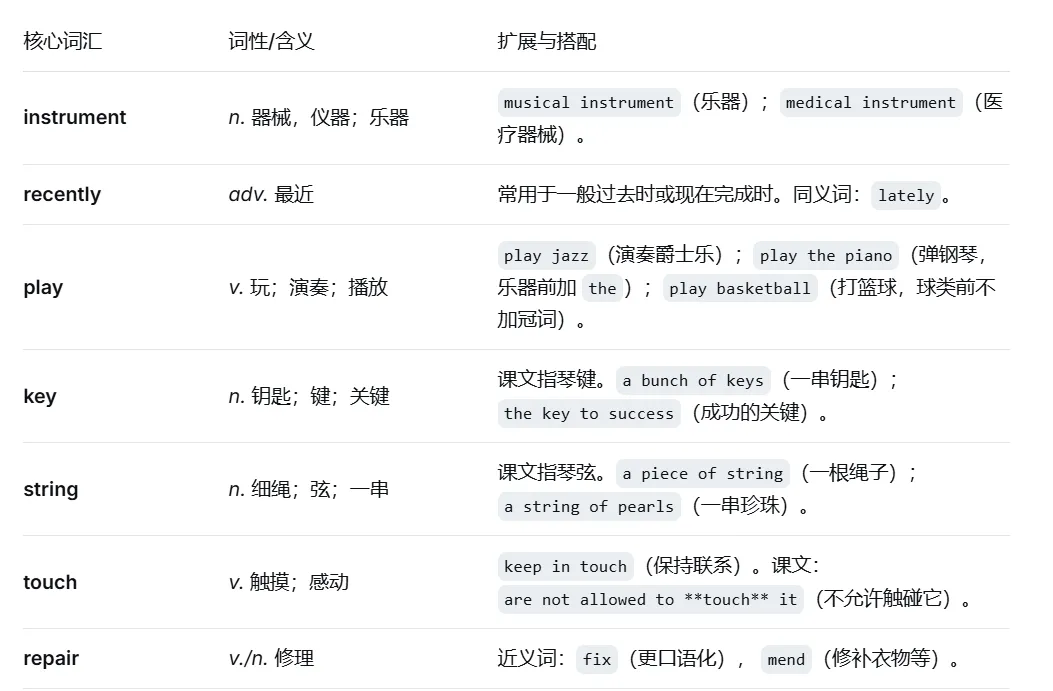 词汇辨析:musical(音乐的/音乐剧) vs. music(音乐);damage(损坏) vs. destroy(毁坏)