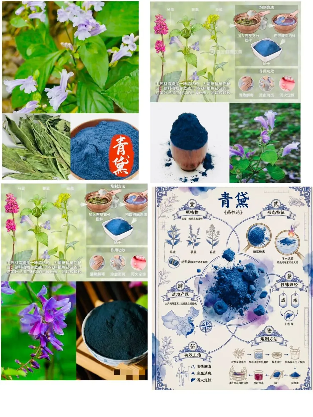 1)来源与性味:爵床科马蓝、蓼科蓼蓝或十字花科菘蓝的叶或茎叶加工制得的干燥粉末或团块。性味:咸,寒。功能:清热解毒,凉血消斑,泻火定惊。