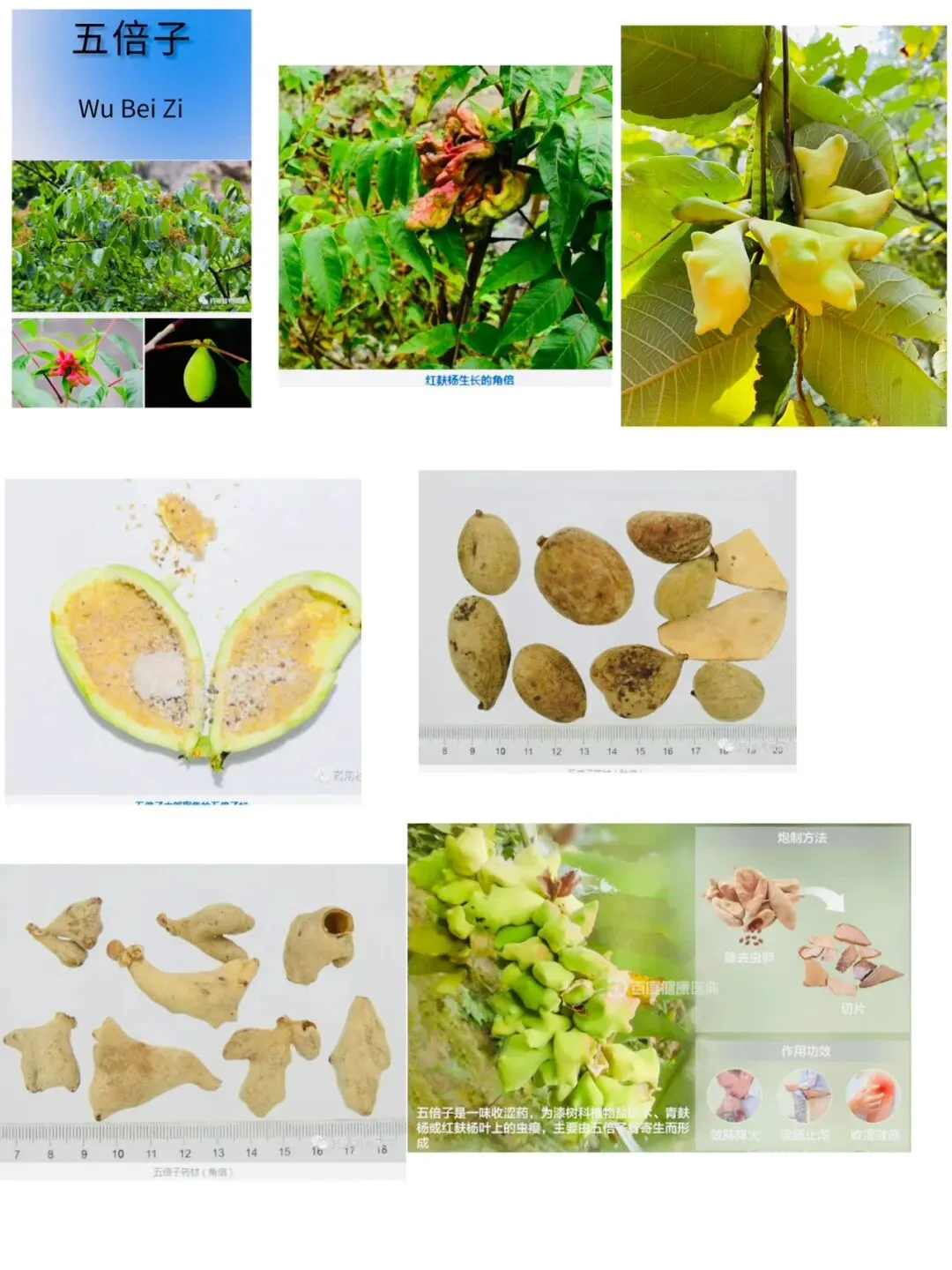1)来源与性味:漆树科植物盐肤木等叶上的虫瘿,主要由五倍子蚜寄生形成。