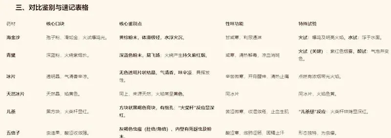 1.海金沙与青黛均为粉末,但颜色(黄棕 vs 深蓝)和火试现象(爆鸣光焰 vs 紫红烟雾)截然不同。