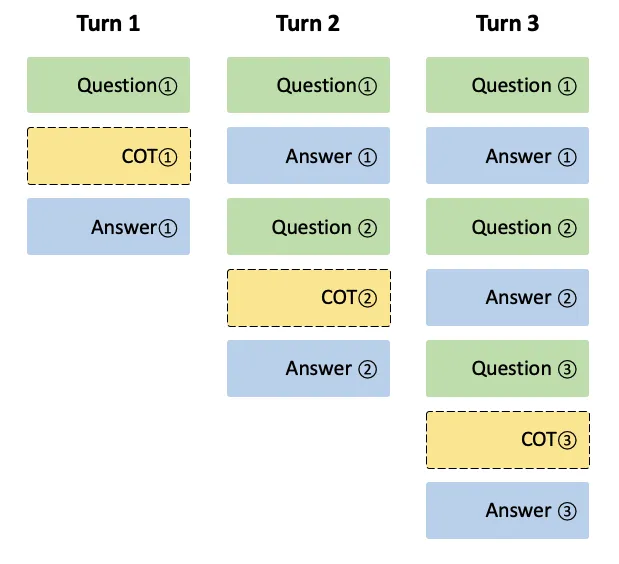 在对话的每一轮中,模型都会输出思维链(reasoning_content)和最终答案(content)。在下一轮对话中,前几轮的思维链不会被合并到上下文中,如下图所示: