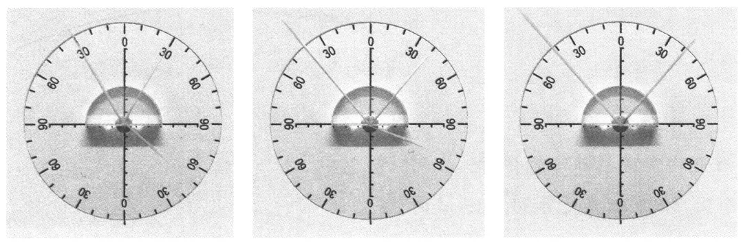 答案 入射角为0°,折射角也为0°,光线沿直线射出;随着入射角的逐渐增大,折射角逐渐增大,折射光线亮度逐渐减弱;反射角逐渐增大,反射光线亮度逐渐增强;当入射角增大到某一角度时,折射角达到90°,折射光线消失,所有光线全部反射。