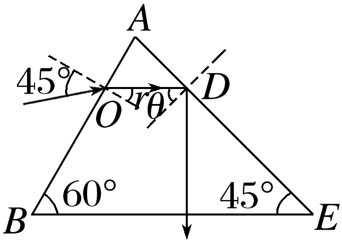 由几何知识可知光线在AE面上的入射角为θ=45°。