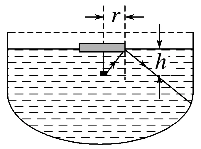 (2023·广州市高二期中)为了表演“隐形的大头针”节目,某同学在半径为r的圆形薄软木片中心竖直插入一枚大头针,并将其放入盛有水的碗中,如图所示。已知水的折射率为43,为了保证表演成功(在水面上看不到大头针),大头针末端离水面的最大距离h为( )