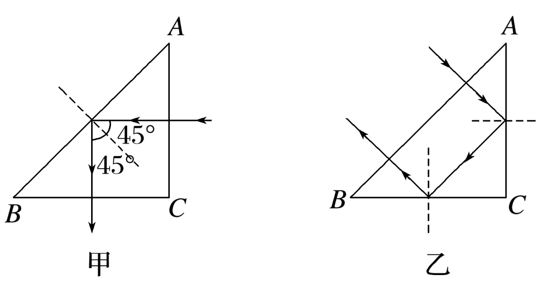 2.全反射棱镜的特点:当光垂直于它的一个界面射入后,都会在其内部发生全反射,与平面镜相比,它的反射率高,几乎可达100%。