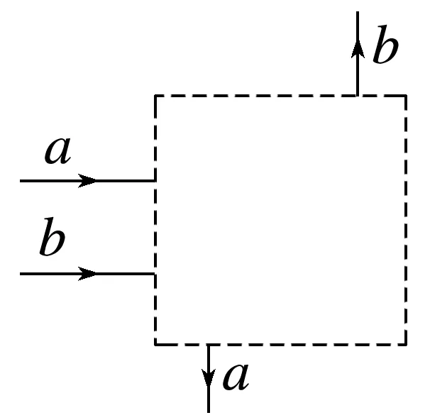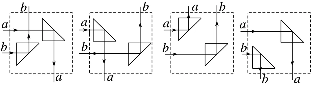 空气中两条光线a和b从方框左侧入射,分别从方框下方和上方射出,其框外光线如图所示。方框内有两个折射率n=1.5的全反射玻璃棱镜。下列选项给出了两棱镜的四种放置方式的示意图。其中能产生图中效果的是( )