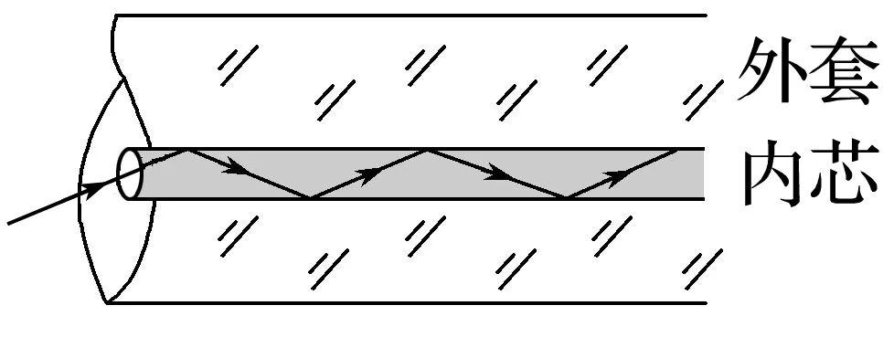 ①光导纤维的传播原理:光由一端进入,在内芯和外套的界面上经过多次全反射,从另一端射出,光导纤维可以远距离传播光信号,光信号又可以转换成电信号,进而转变为声音、图像。