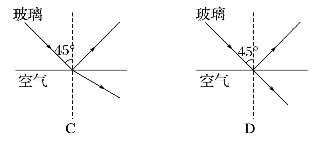 2.(2023·深圳市高二期中)一束光线从折射率为1.5的玻璃射入空气,在界面上的入射角为45°。如图所示的四个光路图中正确的是( )
