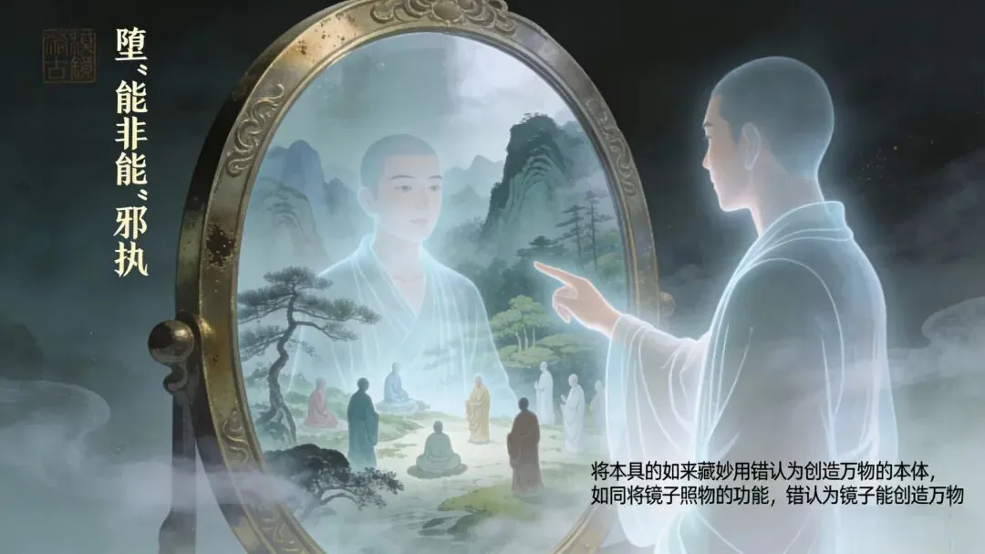 六祖云:“何期自性,本来清净;何期自性,不生不灭(体);何期自性,本自具足(相);何期自性,本无动摇;何期自性,能生万法(用)。” 包含体相用,体空相明用周遍,三者完整一体,三而一,一而三,不能割裂,亦不可混淆。此处的偏差就是将本具的如来藏妙用当成本体,如同将镜子照物的功能,错认为镜子能创造万物。