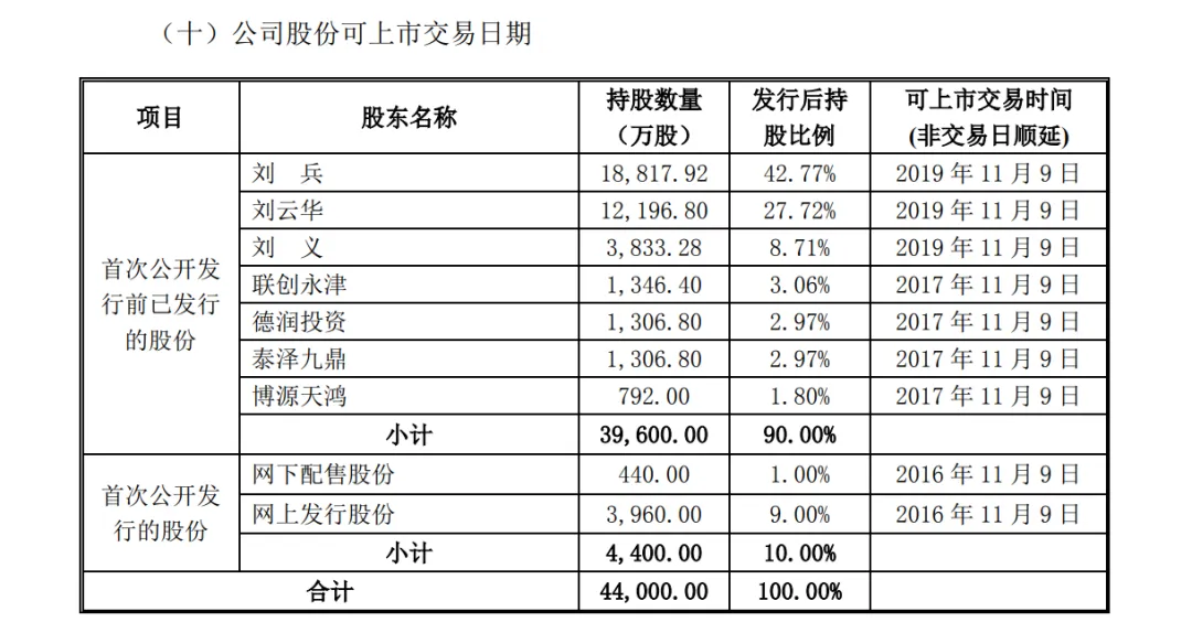 2016年11月9日,发行4400万股,占发行后总股本10%,发行价23.49元,发行市盈率为22.99倍,共融资10.34亿人民币。