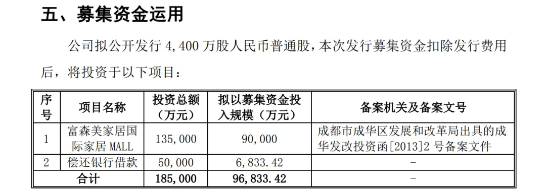 融资的10.34亿在扣除发行费用后投入“富森美家居国际家居MALL” 项目和偿还银行借款,也就是扩张和还钱,其中大头用于扩张。