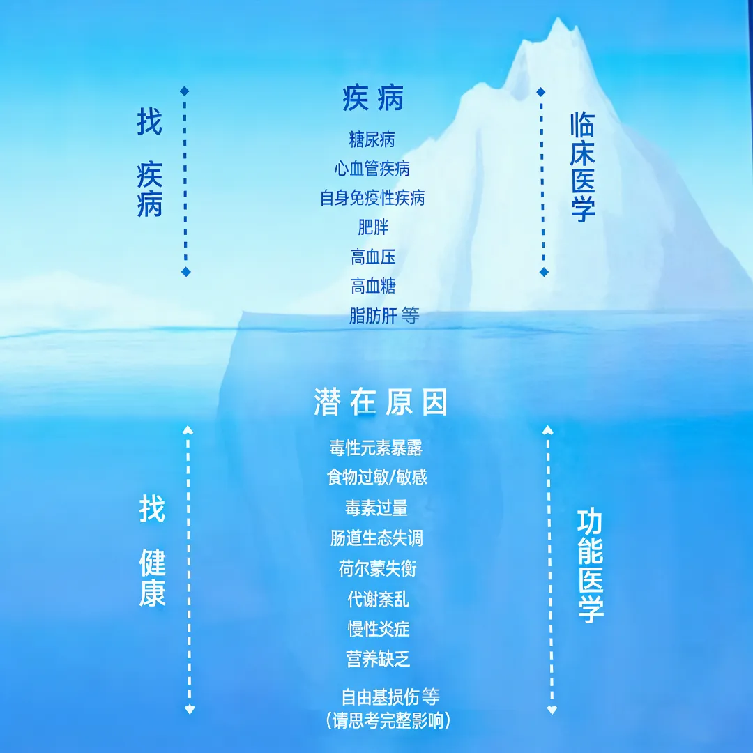 而功能医学做的,就是“潜入水下,找到冰山的根基”——它会通过严谨的科学检测,比如查生化指标、基因序列、肠道菌群、代谢水平,一点点挖掘那些看不见的失衡原因,找到真正的病因。