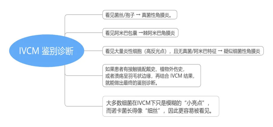 1. 角膜活体共聚焦显微镜(invivo confocal microscopy,IVCM)检查:因IVCM放大率和分辨率具有局限性,目前尚不能直接识别常见细菌,仅用于细菌性角膜炎的鉴别诊断。诺卡菌性角膜炎的IVCM检查结果具有一定特征性。