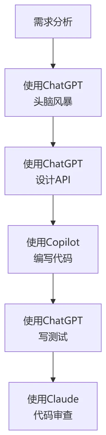 图表讲解:这张图记录了我开发用户认证API时使用的多工具协同工作流,是我实际项目中的真实经验。需求分析阶段先用ChatGPT做头脑风暴——"用户认证系统需要哪些功能?它能给出全面的checklist(注册、登录、登出、密码重置、权限管理等)。API设计阶段继续用ChatGPT——"设计REST API的端点和数据结构",它能输出清晰的API文档。编码阶段切换到GitHub Copilot——在IDE里写代码时,Copilot实时补全函数体、错误处理、类型定义等。测试阶段又回到ChatGPT——"为注册API写单元测试,覆盖正常和异常情况",它能生成完整的测试用例。最后代码审查用Claude——因为它擅长分析长文本、发现潜在问题、给出改进建议。这个工作流的关键是"工具各司其职"——不是只用一个工具,而是根据每个工具的强项选择合适的工具。这样效率最高(省时3.5小时 vs 传统8小时),质量也最好(ChatGPT生成、Copilot补全、Claude审查)。记录这个案例是因为它证明了多工具配合的威力。