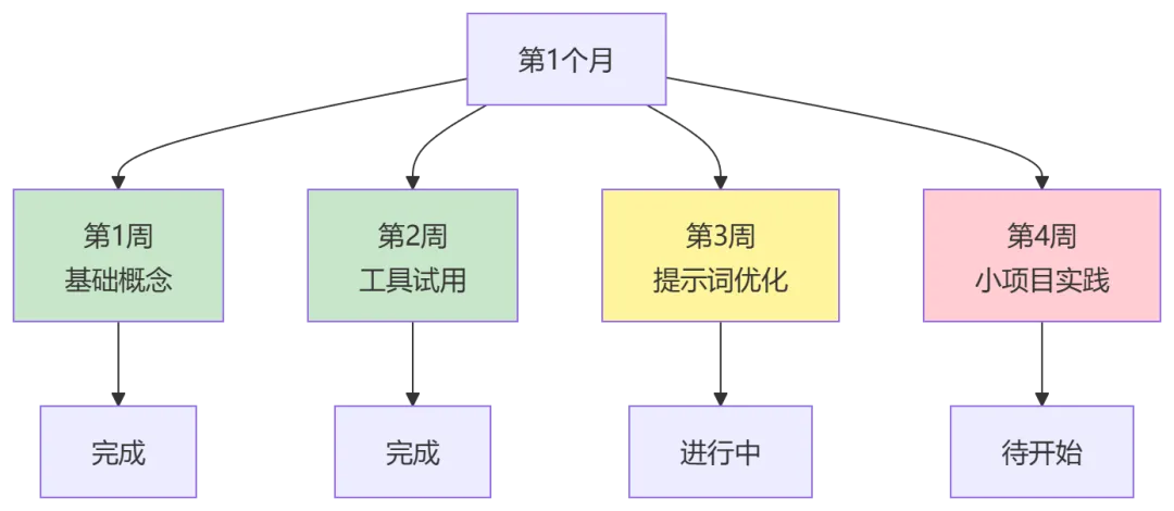 第1个月被分解为4周,每周有明确的学习目标。第1周基础概念——学习什么是大语言模型、AI辅助编程的核心原理、主流工具的特点和区别(绿色节点,已完成)。
