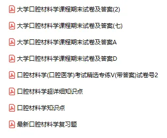 今天分享的资料是「口腔材料学」电子版+学习笔记+知识点总结+期末考试重点+复习资料+习题集及答案+名词解释+历年真题试卷及答案+题库及答案+复习重点+思考题及参考答案+公式总结+考试重点基础题+知识总结+高清PDF可打印+免费分享!